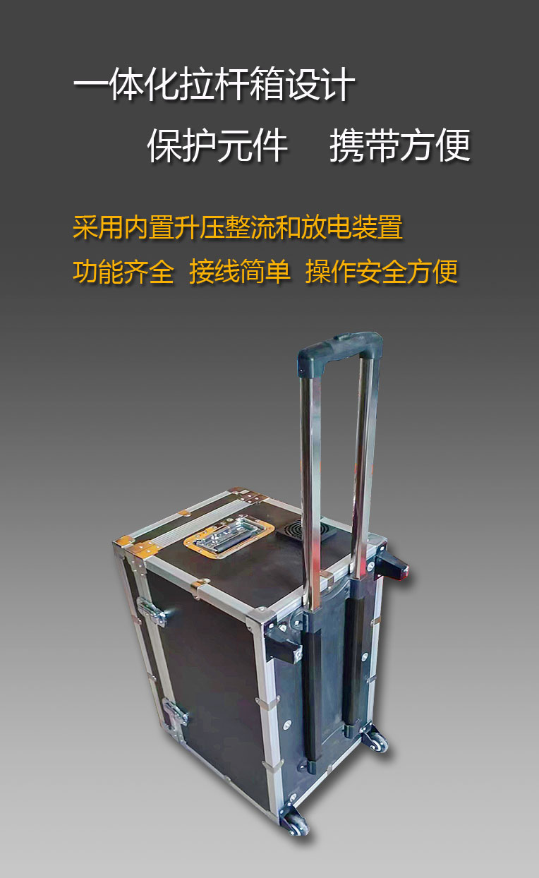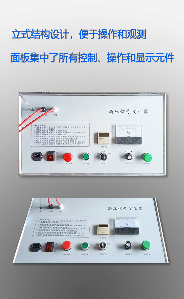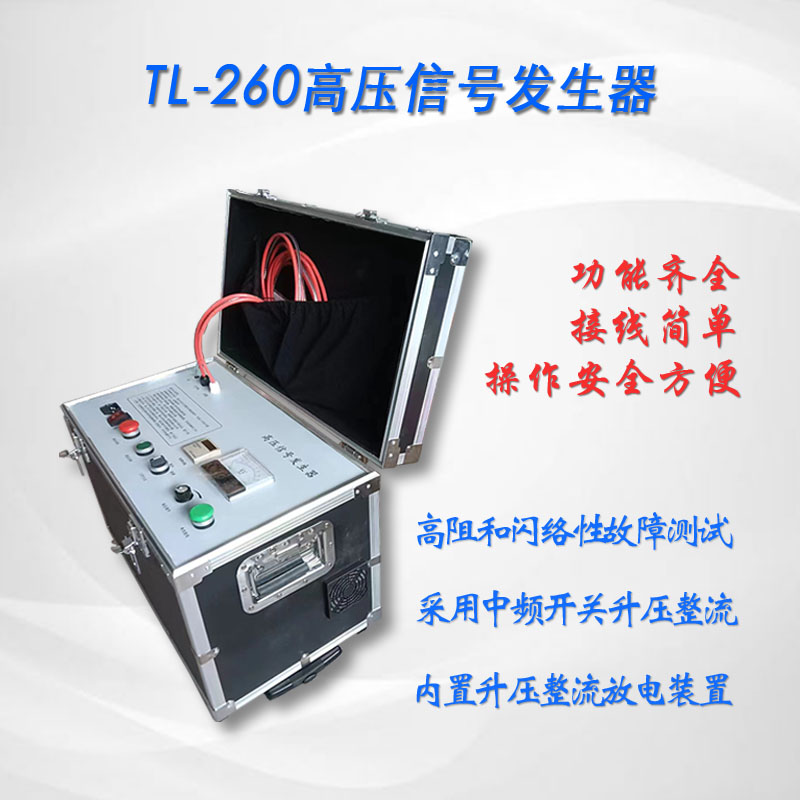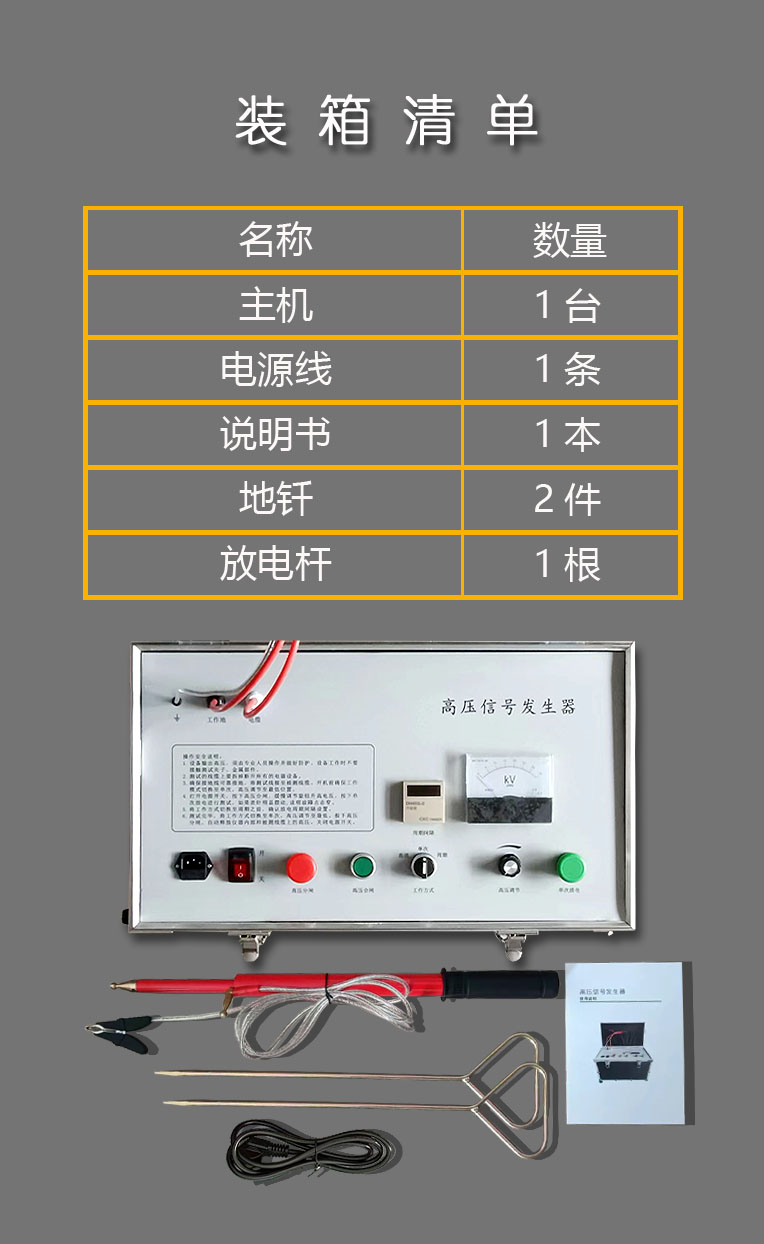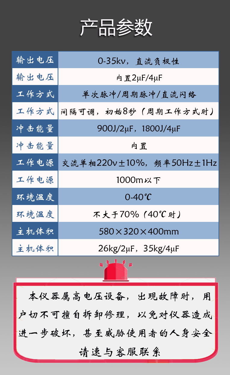 260高压信号发生器-详情 产品可选配置: 电容样式: 一体机 分体式 信号发生器主机|电源线|地钎|放电杆|说明书 政策条例 您必须遵守相关政策,严禁下载本站一切图片素材。 最终解释权归淄博特力电子技术有限公司所有 产品特点 采用内置升压整流和放电装置 立式结构设计,便于操作和观测 单次放电和周期放电,两种工作方式灵活选择 一体化箱体设计,保护元件,携带方便 技术指标 输出电压:0-30kV,直流负极性 放电电容:内置2uF,4uF,外置4uF 工作方式:单次脉冲/周期脉冲/直流闪络 放电周期:间隔可调,出厂设置8秒(周期脉冲工作方式时) 冲击能量:900J/2uF,1800J/4uF(脉冲工作方式30kV时) 放电装置:内置 工作电源:交流单相220V±10%,频率50Hz±1Hz 海拔高度:1000m以下 环境温度:0-40℃ 相对湿度:不大于70%(40℃时) 主机体积:580*320*400(内置),380*280*370(外置) 主机重量:26kg/2uF,35kg/4uF,12kg/外置电容式