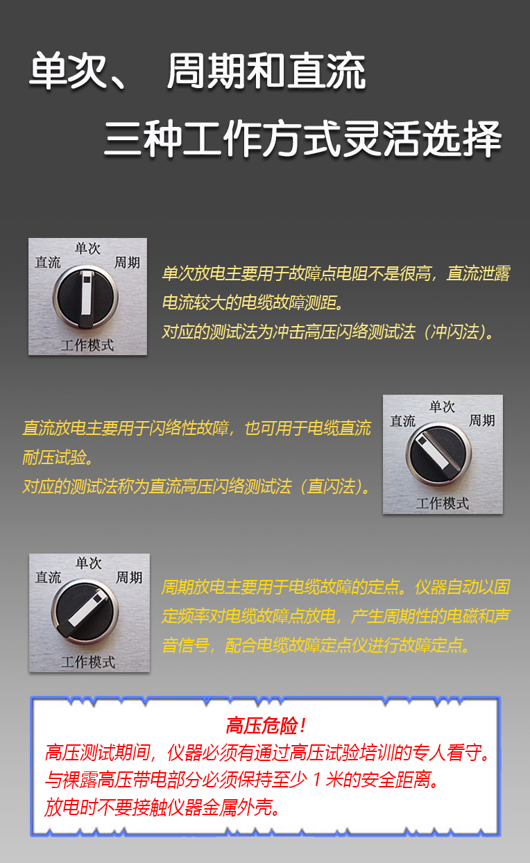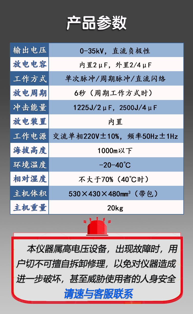高压信号发生器-详情 信号发生器主机|电源线|电源适配器|高压输出连接|说明书 政策条例 您必须遵守相关政策,严禁下载本站一切图片素材。 最终解释权归淄博特力电子技术有限公司所有 产品特点 本仪器内置升压整流和放电装置,功能齐全,接线简单,操作安全方便。 技术指标 输出电压:0-35kV,直流负极性放电电容:2/4uF(可定制)工作方式:单次脉冲/周期脉冲/直流闪络放电周期:6秒(周期工作方式时) 冲击能量:1225J/2uF,2500J/4uF放电装置:内置工作电源:交流单相220V±10%,频率50Hz±1Hz海拔高度:1000m以下环境温度:-20-40℃相对湿度:不大于70%(40℃时)