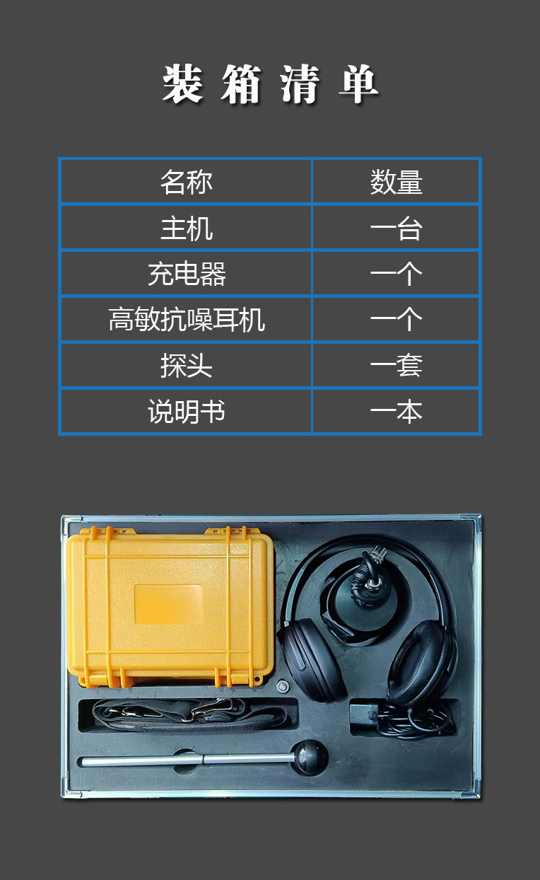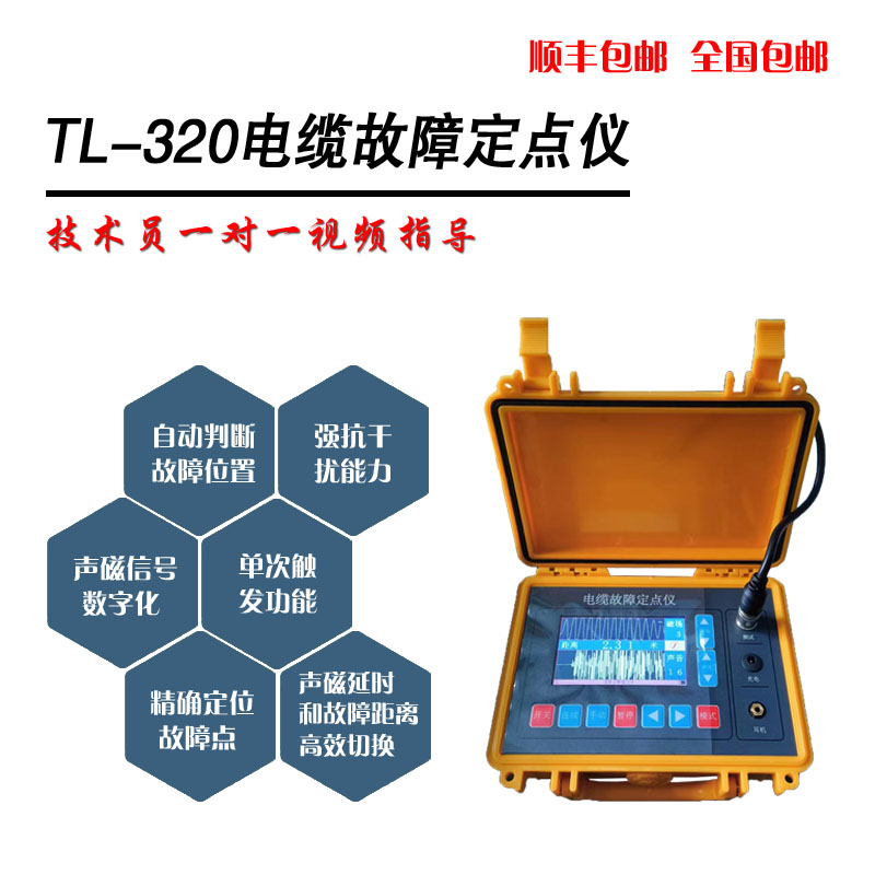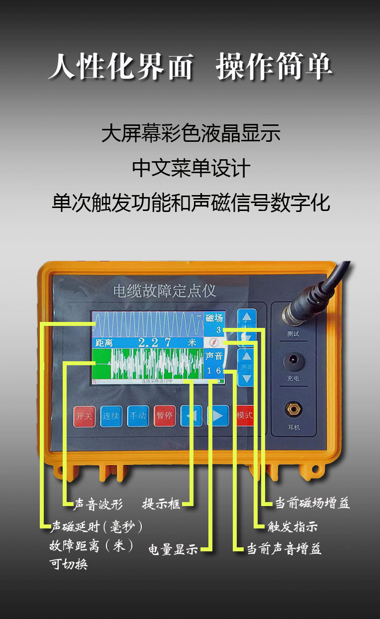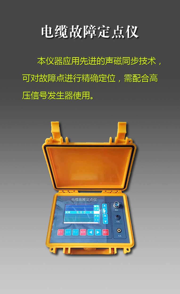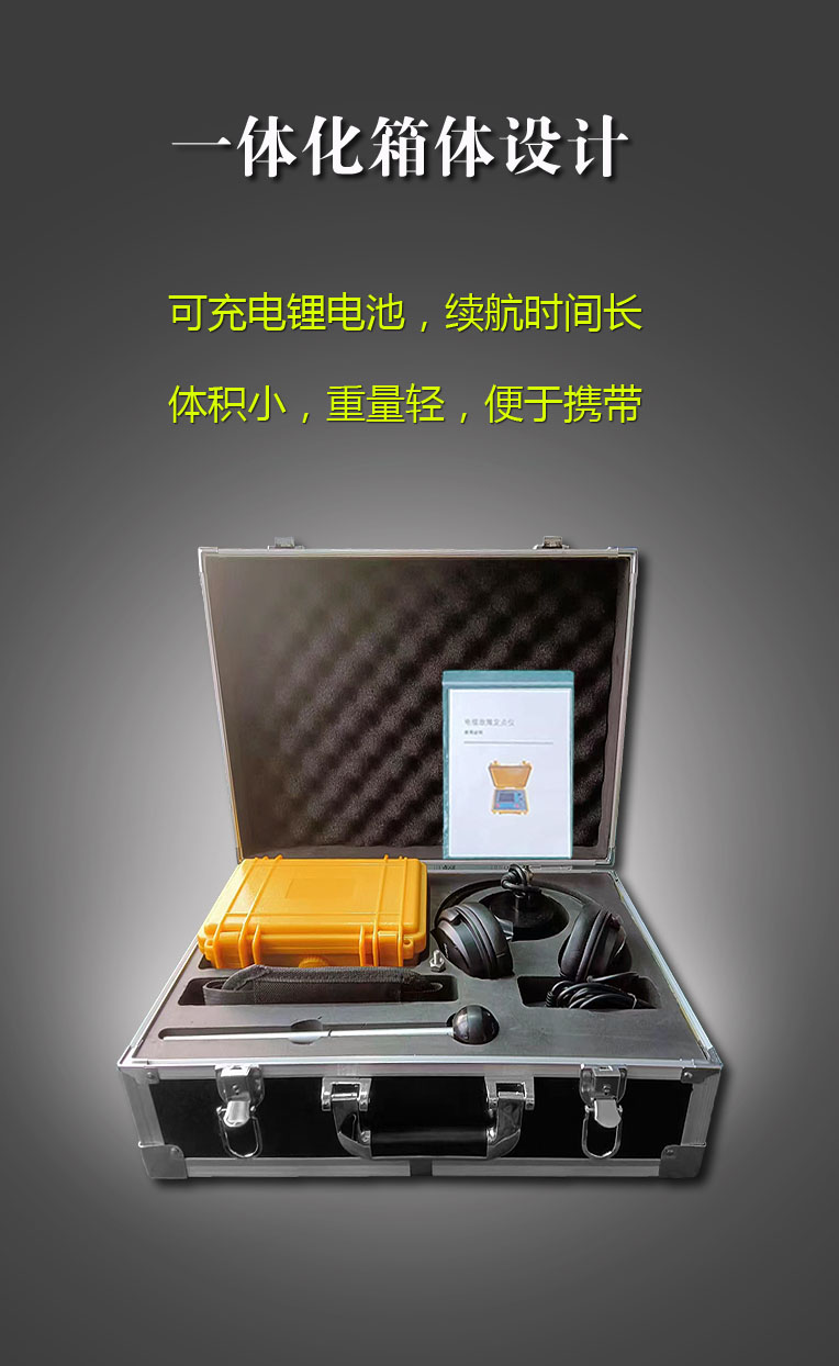 声磁同步定点仪(标准版)-详情 定点仪主机|充电器|高敏抗噪耳机|探头|说明书 政策条例 您必须遵守相关政策,严禁下载本站一切图片素材。 最终解释权归淄博特力电子技术有限公司所有 产品特点 1、采用高精度算法,自动判断故障位置。 2、声磁延时时间和故障距离可切换,使用更高效 3、具有单次触发功能,停止接收新信号,更利于波形分析 4、声磁同步接收,抗干扰能力强 5、声磁信号数字化,更便于分析。 6、应用高敏抗噪耳机,更灵敏更抗干扰。 7、使用彩色大屏,信息更直观,操作更便捷。 8、整机尺寸小巧,更便携。 9、内置大容量锂电池供电,更方便。 技术指标 声音信号通频段:中心频率 400Hz,带宽 200Hz。 信号增益:80dB。 定点精度:0.1m。 电池:7.4V 充电,内置大容量锂电池 充电器:输入 AC220V±10%,50Hz;标称输出 8.4v,DC1A 显示方式:4.3寸彩色液晶大屏 使用条件:温度:-10℃—40℃,湿度 5-90%RH,海拔<4500。