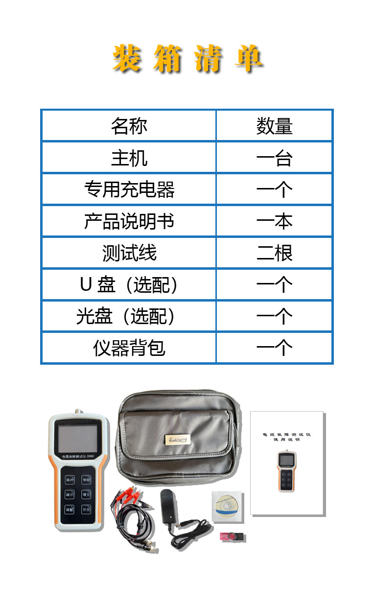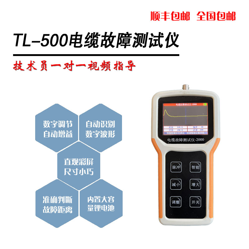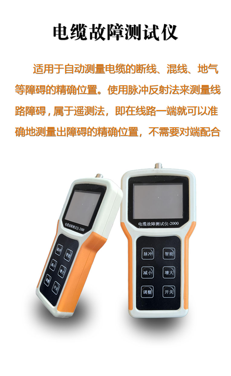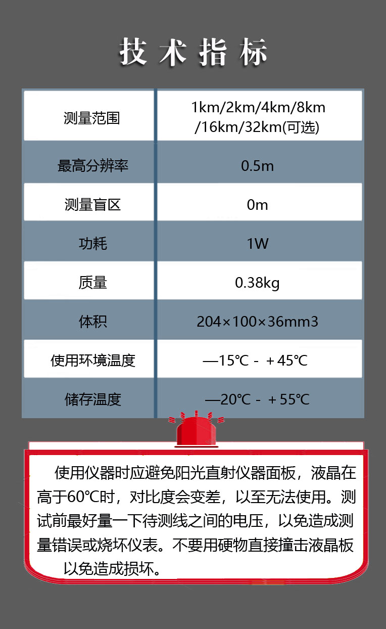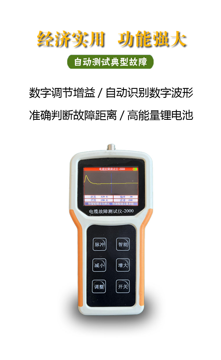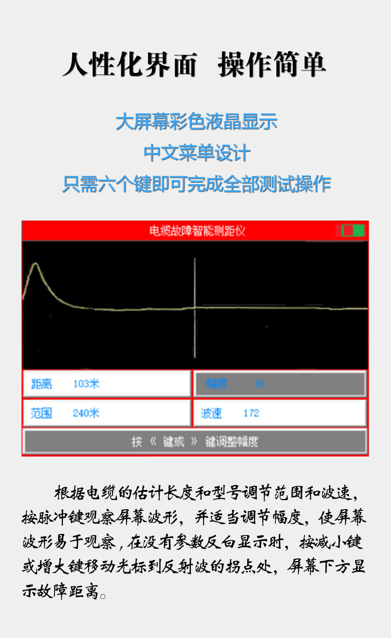 手持测试仪-详情 主机|充电器|产品说明书|测试线|U盘(选配)|光盘(选配)|仪器背包 政策条例 您必须遵守相关政策,严禁下载本站一切图片素材。 最终解释权归淄博特力电子技术有限公司所有 产品特点 1)DAGC(数码增益自动控制)系统:可数字调节增益。杜绝原有同类型仪器因电位器旋钮的原因造成波形的失真。亦可做纯线形调节,有利于人工测试。 2)数字波形自动识别技术:依靠机器自动识别人工难以判断的波形,并且彻底清楚测试盲区。 3)采用高档(真 32 位)ARM 单片微机配合现场可编程门阵列技术,有利于仪器快速进行各种复杂运算、准确判断故障波形。 4)大屏幕彩色液晶显示,人性化界面中文菜单设计,只需六个键,即可完成全部测试操作。 5)高能量锂电池,使用时间可达十小时(配合专用充电器充电)。 技术指标 1)测量范围:1Km/2Km/4Km/8Km/16KM/32KM(可选) 2)最高分辨率: 1m 3)测量盲区: 0m 4)功耗: 1W 5)质量: 0.38KG 6)体积: 204×100×36m㎡ 7)使用环境温度:—15℃-+45℃ 储存温度: —20℃-+55℃