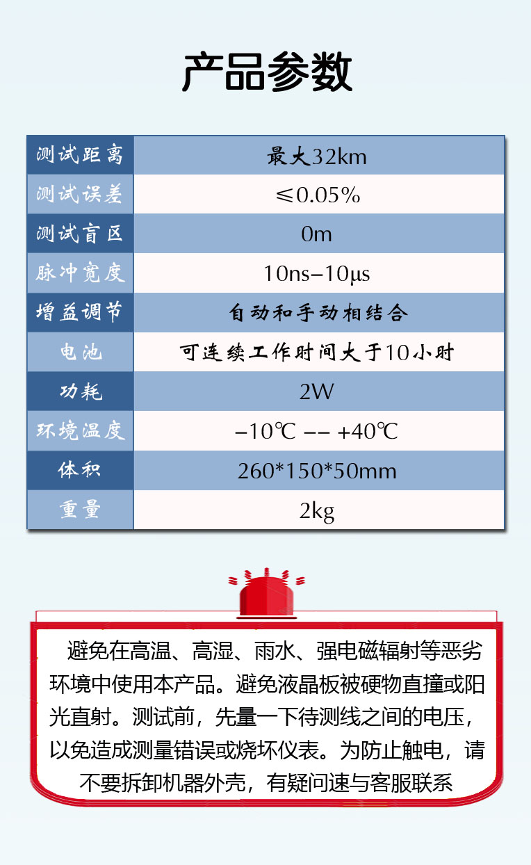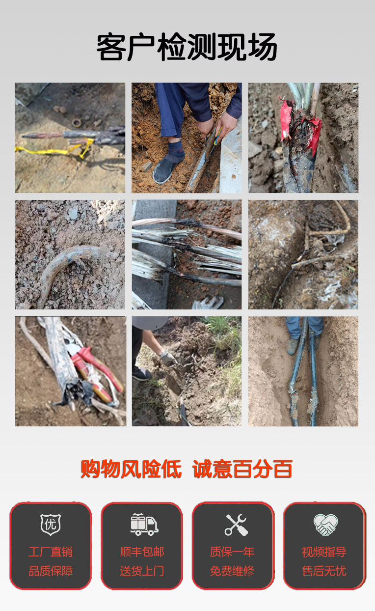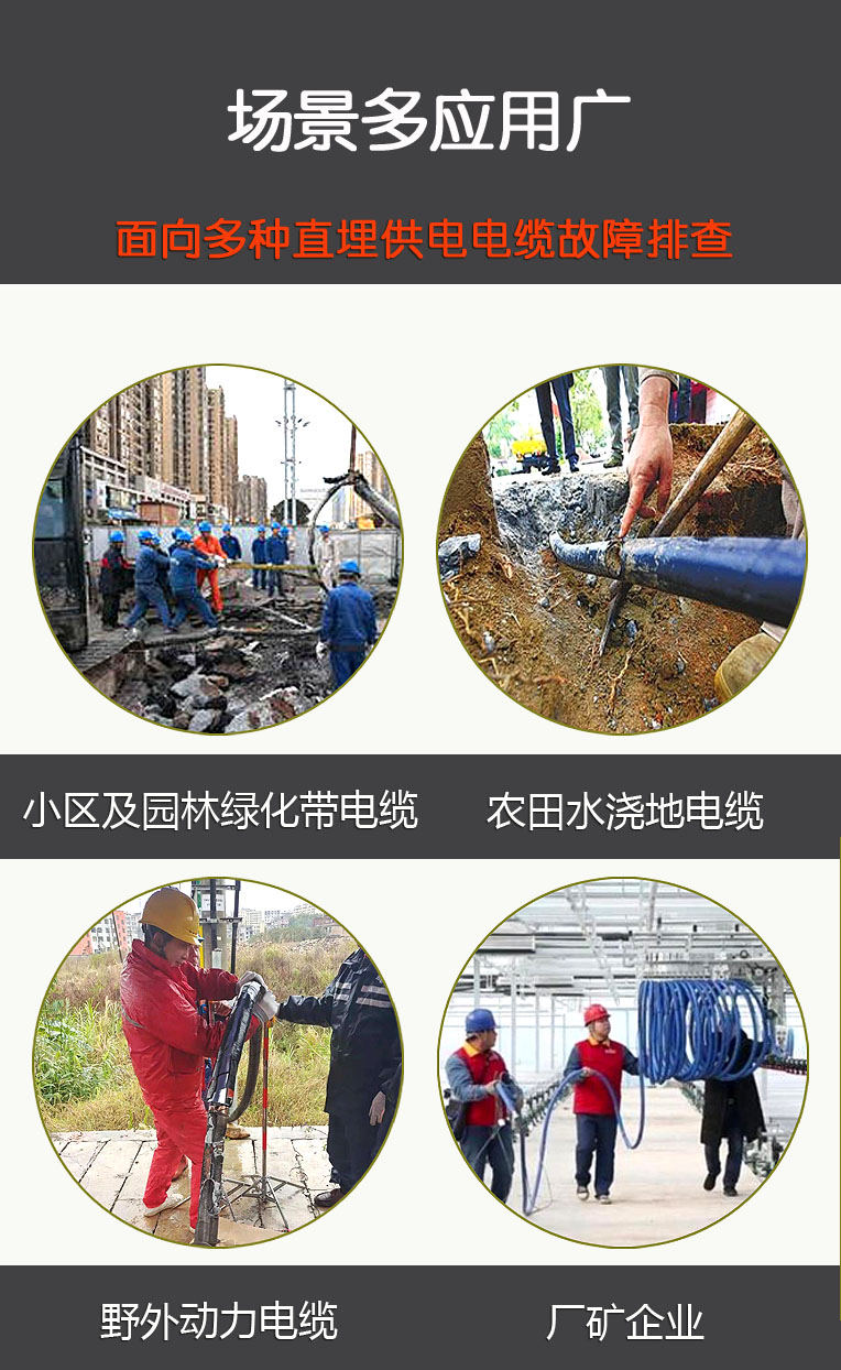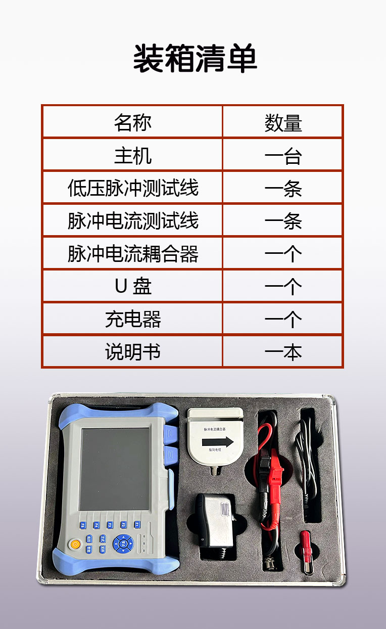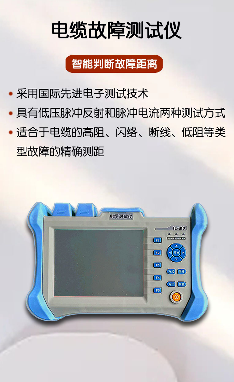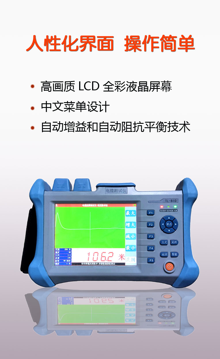 电力电缆故障测距仪-详情 电力电缆故障测距仪主机|低压脉冲测试线|脉冲电流测试线|脉冲电流耦合器|U盘|充电器|说明书 政策条例 您必须遵守相关政策,严禁下载本站一切图片素材。 最终解释权归淄博特力电子技术有限公司所有 产品特点 1、结合了低压脉冲反射和脉冲电流两种测试方式,可以测试断线、低阻、高阻、闪络等故障。 2、智能判断故障距离。低压脉冲和脉冲电流方式下都能自动判断故障点的距离。 3、测试精度高,在量程小于 1KM 时测试精度小于±1M;在量程大于 1KM时,测试精度小于 0.5%。 4、采用中文菜单技术,易于掌握和使用。 5、采用高画质 LCD 全彩液晶屏幕 6、采用可充锂离子电池,自动充电管理。 7、体积小,重量轻,便于携带。 技术指标 1、脉冲反射测试法: 最大测试距离: 32KM 测试精度: 测试距离小于 1KM 时,测试误差不大于±1M 测试距离大于 1KM 时,测试误差不大于 0.5% 测试盲区:0M 脉冲宽度:10ns-10μs 阻抗平衡自动调节 增益调节:自动和手动相结合 慢点状态下可连续工作时间大于 10 小时 功耗:2W 使用环境温度:-10℃ -- +40℃ 体积:260*150*50mm³ 重量:2KG