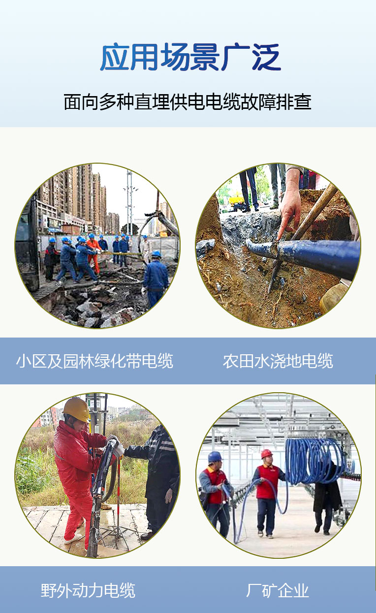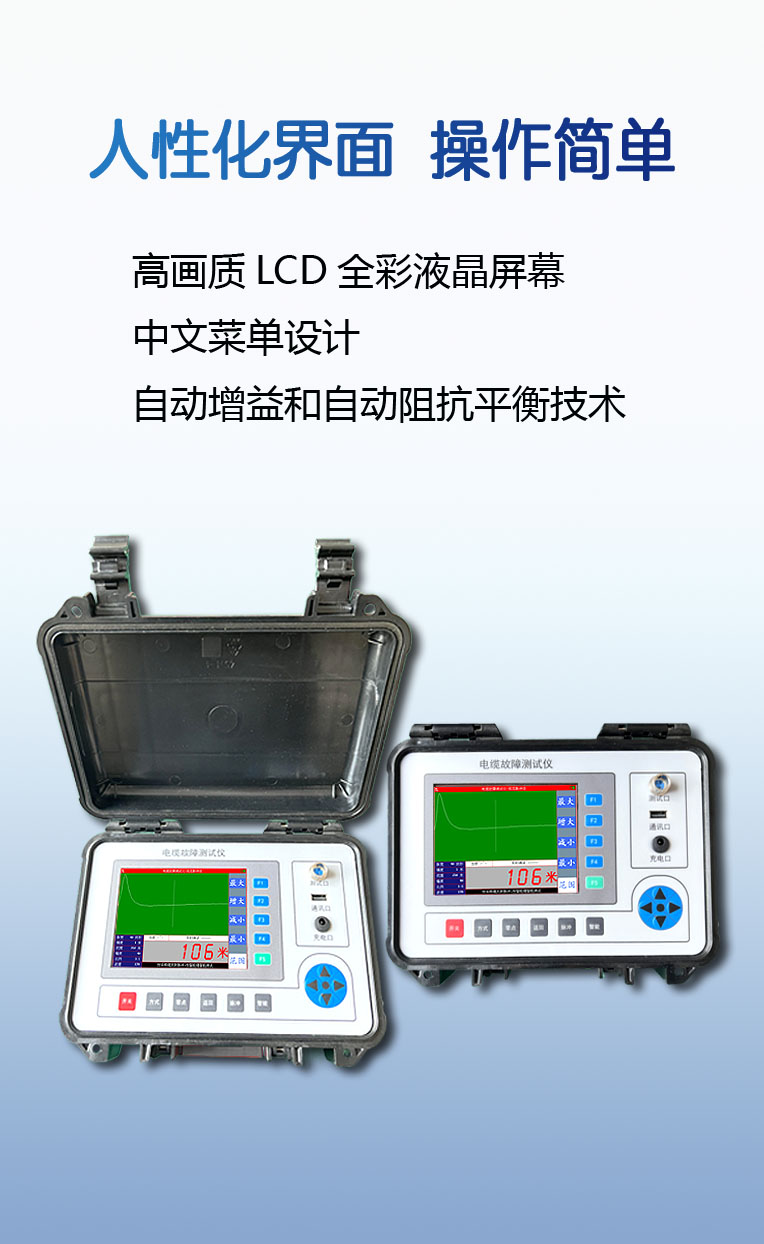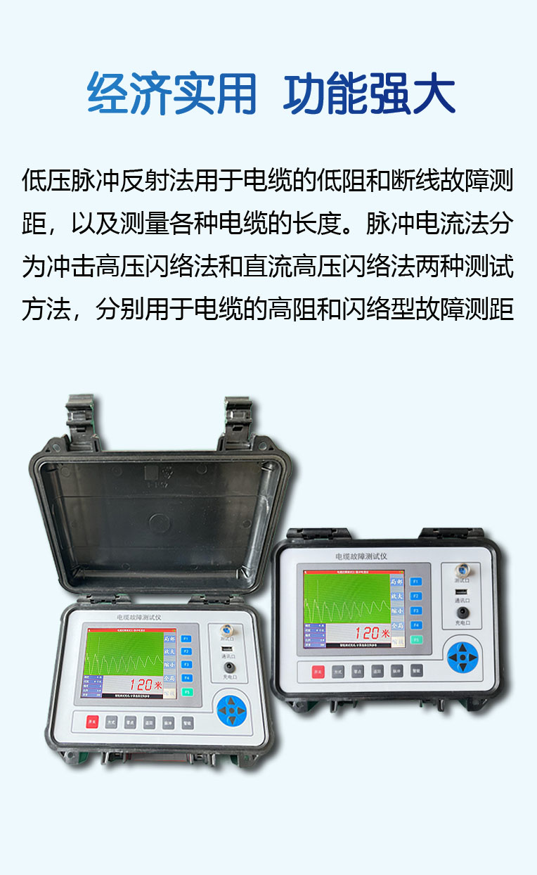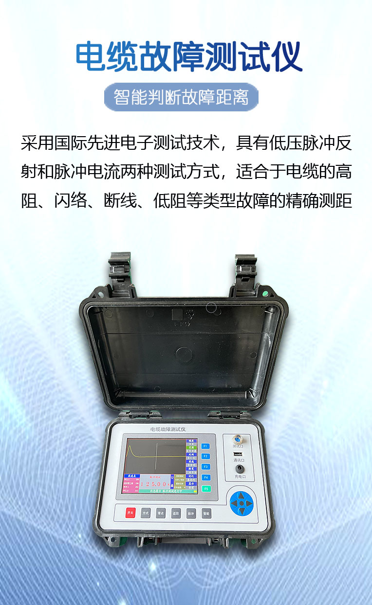 电力电缆故障测距仪(以下简称测距仪)采用国际先进的电子测试技 术,具有低压脉冲反射和脉冲电流两种测试方式,适合于电缆的高阻、 闪络、断线、低阻等类型故障的精确测距。低压脉冲反射法用于电缆的低阻和断线故障测距,以及测量各种电 缆的长度。脉冲电流法分为冲击高压闪络法和直流高压闪络法两种测试 方法,分别用于电缆的高阻和闪络型故障测距。