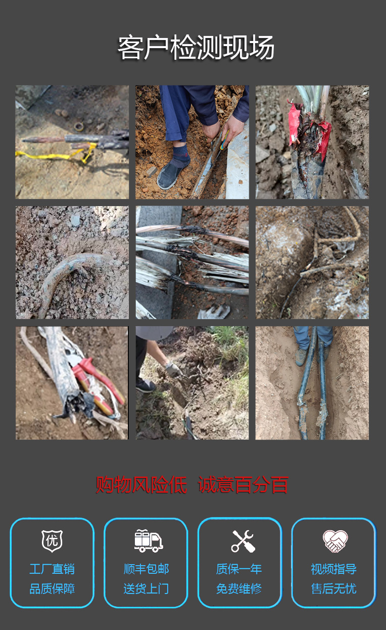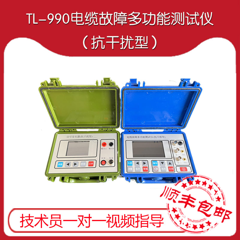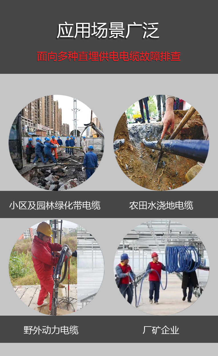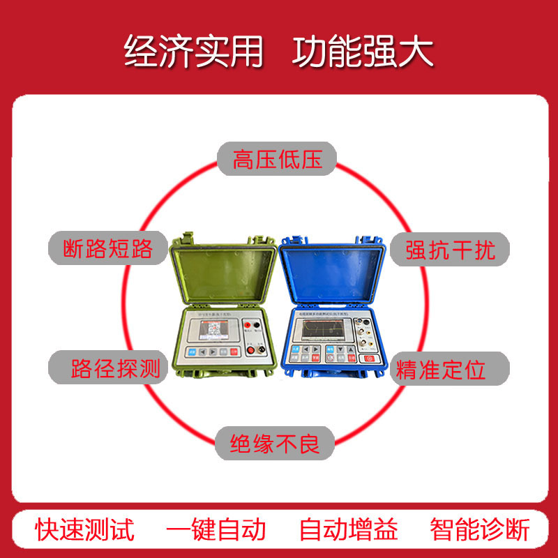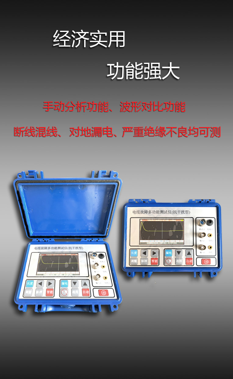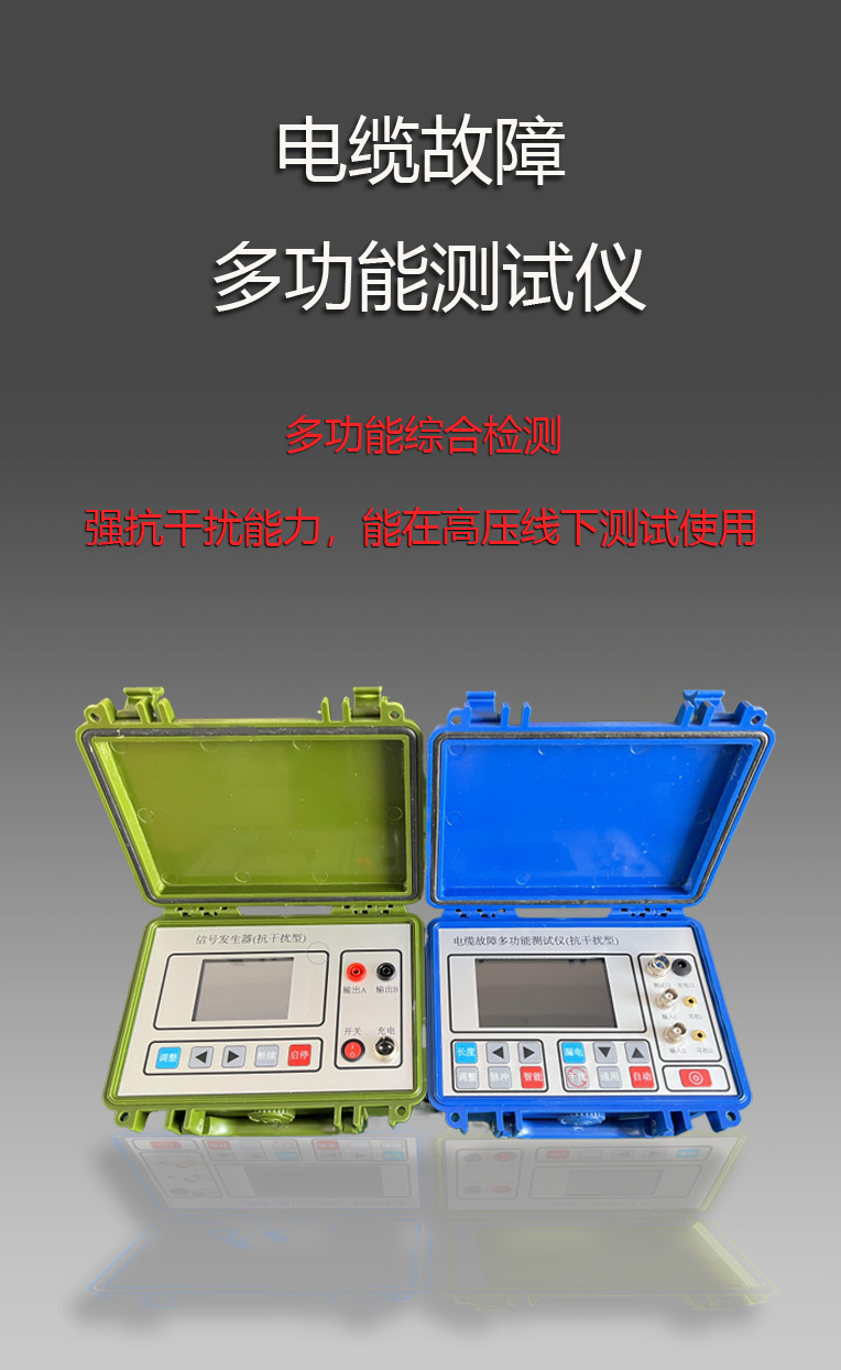 电缆故障多功能测试仪(抗干扰型)采用 ARM+FPGA+大点阵彩色液晶 显示技术研制成功的最新一代电缆测试产品。具有脉冲反射测试断线、 短路长度,配合信号发生器探测铠装电缆准确的走向及对地漏电故障位 置等功能,适用于测量低压铠装地埋电力电缆、视频监控电缆、有线电 视同轴电缆、全塑电缆的断线、短路、对地漏电等故障的精确位置。是 缩短故障查找时间、提高工作效率、减轻线路维护人员劳动强度的得力 工具。在路灯电缆维护、农田水浇地电缆故障查修、小区及园林绿化带 电缆、野外动力电缆、高速公路、厂矿企业、通信基站等直埋供电电缆 故障排查中广泛应用。本仪表在上一代产品的基础上,优化了抗干扰算 法,具有超强抗干扰能力,能在高压线、电缆沟、配电箱位置测试使用。